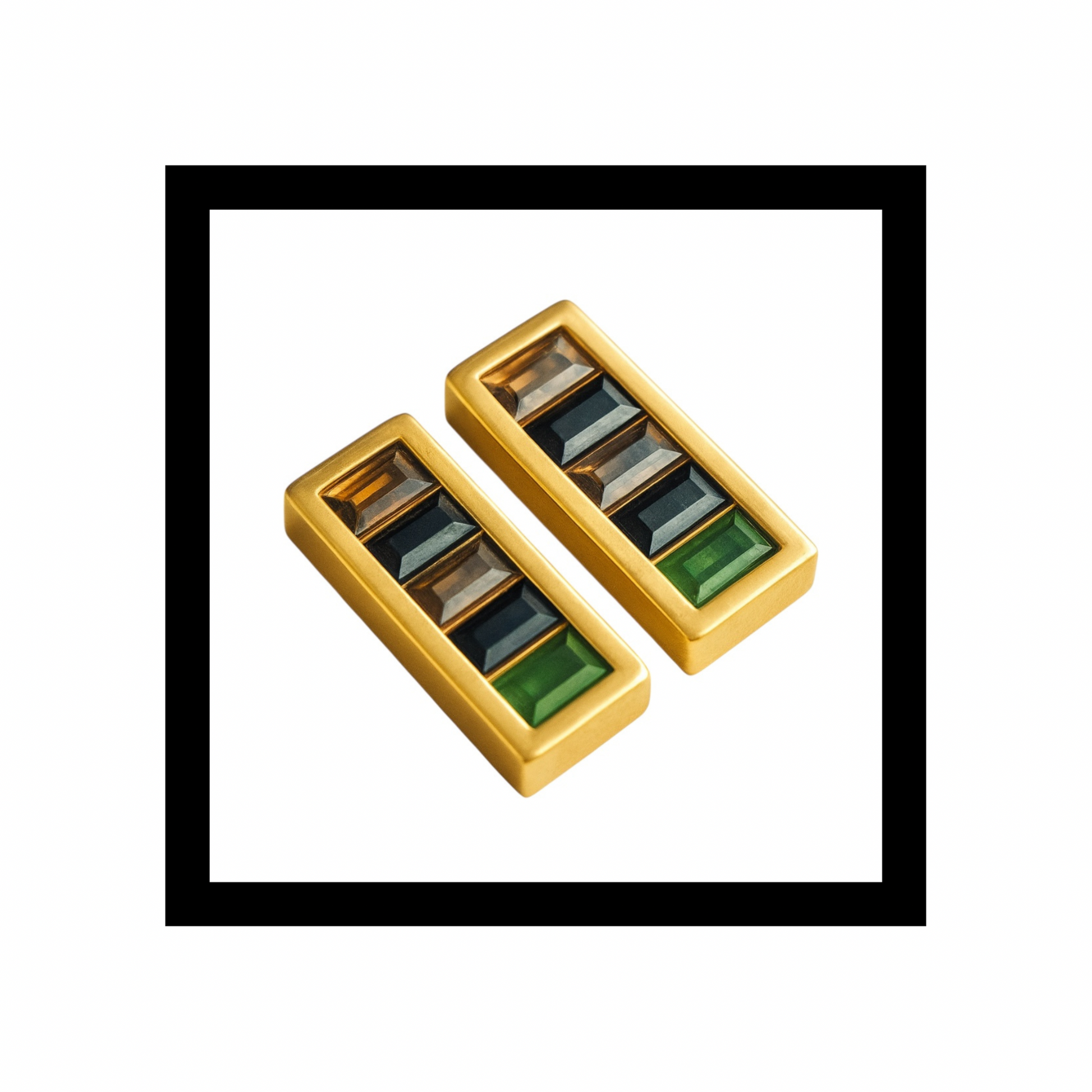 The Canyon Lake Strata Drop Studs feature a vertical sequence of five baguette-cut stones set in polished gold. Alternating black spinel and smoky quartz are grounded by a final green tourmaline, creating a subtle color progression inspired by exposed canyon strata along the water’s edge.