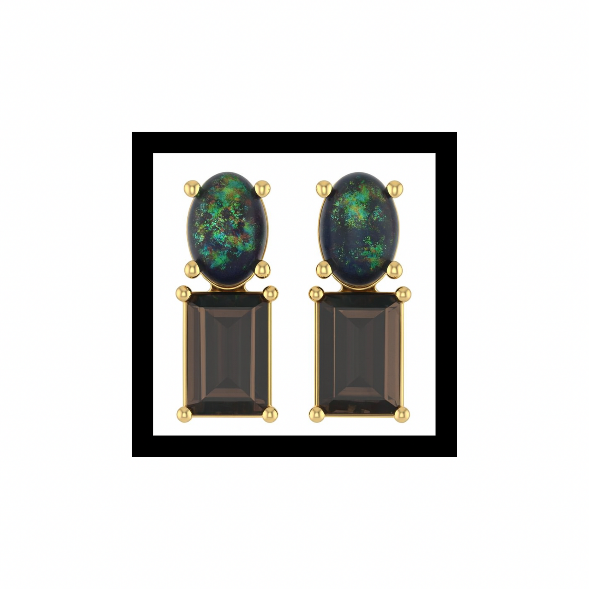 Llano Eclipse Drop Studs: Black Opal + Smoky Quartz in 10K Yellow Gold