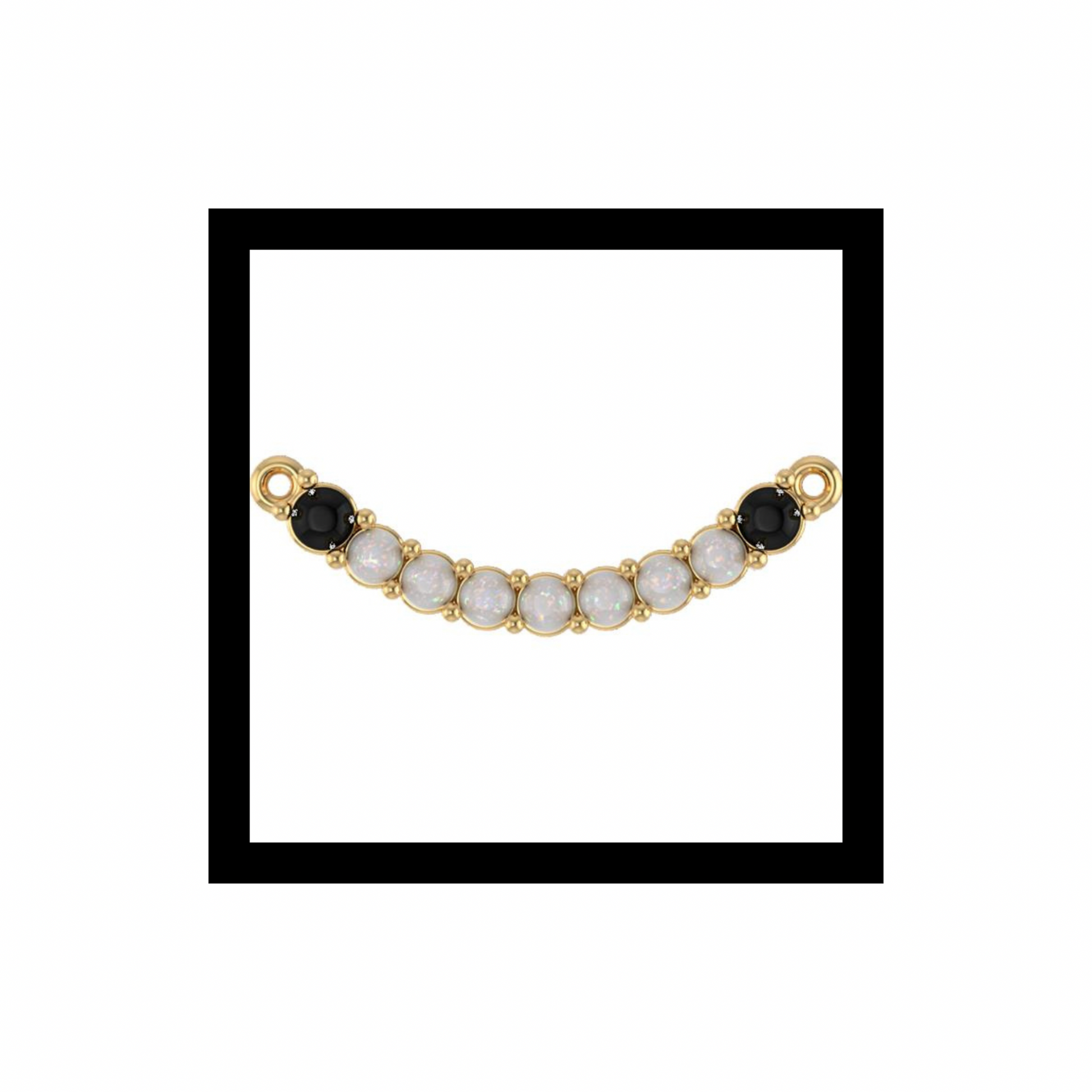 The Riverbend Necklace pairs seven luminous rainbow moonstones with two black onyx bookends, forming a graceful curved bar inspired by the quiet bend of a river at dusk. Set in solid 10K yellow gold with precise micro-prongs, the stones create a continuous line of light and contrast. A slim back rail preserves the arc of the bar, allowing it to rest smoothly against the collarbone. Attached with fixed loops to a delicate gold cable chain, this necklace is designed for everyday wear—minimal, sculptural, and quietly expressive.